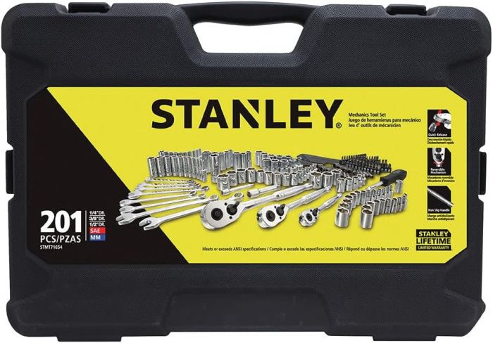El juego de herramientas para mecánicos profesionales STANLEY® 201 Piece es un juego completo de herramientas para mecánicos que incluye trinquetes, barras de extensión, vasos y brocas de tuerca SAE y de tamaño métrico, llaves hexagonales, llaves combinadas y mucho más. Todo está alojado en un estuche de transporte resistente.