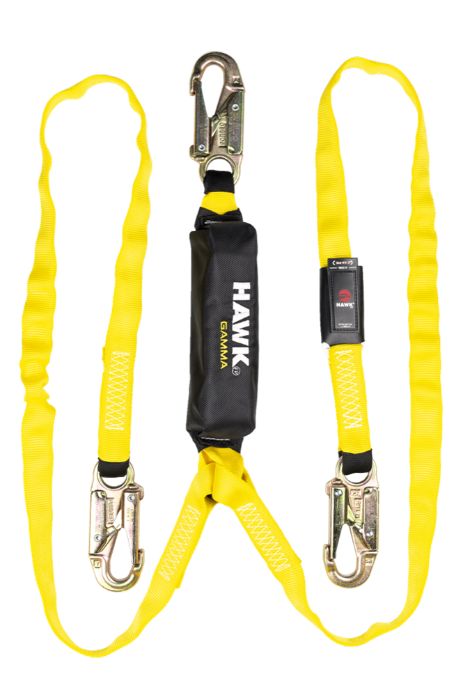 Descripción: Línea o cuerda flexible que sirve para asegurar el arnés a un punto de anclaje, construido con un amortiguador de impacto externo, cuenta con tres ganchos chicos.