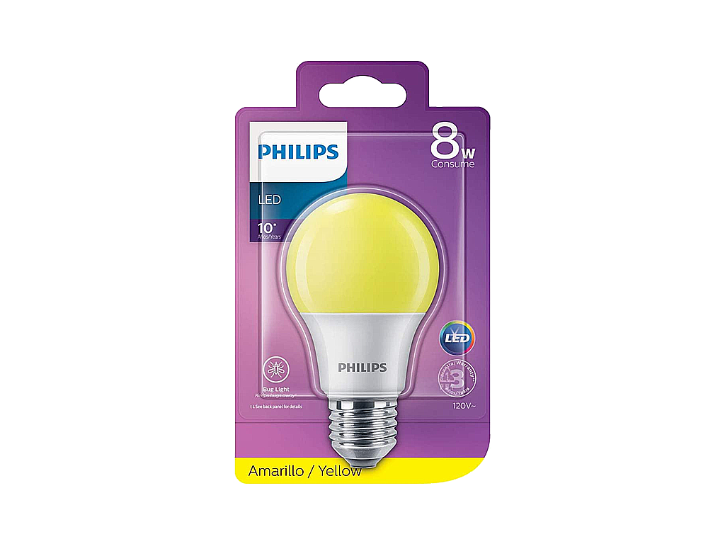 Su tecnología LED proporciona una luz amarilla de 8 watts de potencia equivalente a 60 watts, conectado una corriente de 120 volts. Tiene una vida útil de 10,000 horas y ahorra hasta un 90% de energía eléctrica.Sus dimensiones son 6.3 x 10 cm, con base compatible a entrada E27. Al ser una bombilla Bug Light, su estructura mantiene alejados a la mayoría de los insectos voladores, para dejar el área libre y sin molestias.