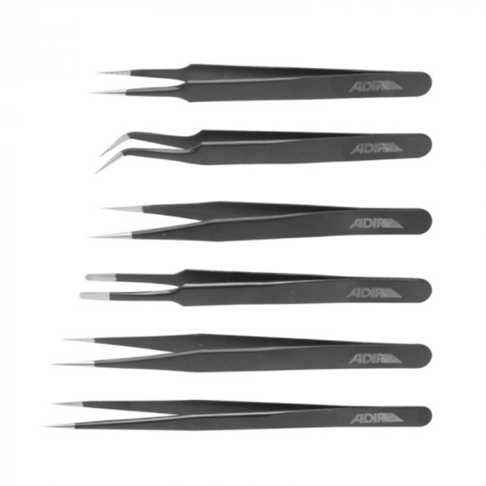 Detalles: Juego pinzetas 6 piezas acero inoxidable Adir 10659 fabricada en acero inoxidable herramienta útil para realizar cualquier tipo de compostura en la joyería o bisutería incluye 6 piezas para cualquier trabajo manual juego de pinzetas.