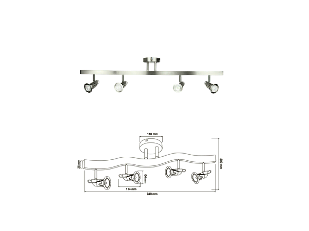Descripción CARACTERÍSTICAS Aplicación: Nombre (s):Bosca III Modelo (s):Sobreponer Techo / Muro Consumo de potencia [W]:100 V~-240 V~ Base (portalámpara):GU10 x 4 Índice de Protección [IP]:NA Pantalla:NA Terminado: SATINADO Tensión Nominal [V~]:100 V~-240 V~ Sobreponer Techo / Muro PARÁMETROS ELÉCTRICOS