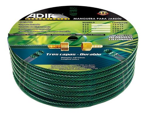 Manguera para jardín 1/2 Pulg 10m AD-230 Adir 100% PVC · Super reforzada. · Conectores de 3/4″. · Diámetro de 1/2″(13 mm). · Conexiones de latón 100% inoxidable. · Manguera tramada de mayor duración.